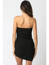 Our Alissa Mini Dress features a strapless bodycon fit with ruched detailing and an asymmetrical hemline. Woven