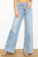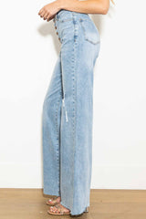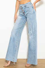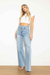 A pair of high-rise wide fit jeans featuring a criss cross waist line, raw edge leg openings, classic 5-pocket construction, and 4 button up closure. (3) Slanted Rise: 10.50", Full Straight Rise: 11.75", Inseam: 33" Model is 5'7" and wearing a size 3 -STRETCH DENIM, HIGH RISED, CRISS CROSS DETAIL, WIDE LEG FIT