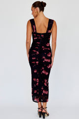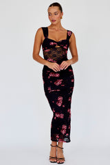 The dress is a form-fitting, ankle-length midi with a black lace overlay featuring a bold floral pattern in shades of pink and red. It has wide shoulder straps and a deep V-neckline with a twisted knot detail at the front, creating a subtle cutout effect. The lace fabric adds a delicate, romantic touch while the fitted silhouette accentuates the figure.