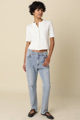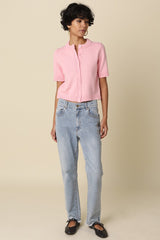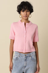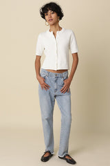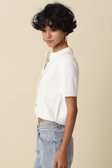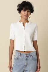 Our Leia Short Sleeve Knit Top features a clean button front design with a collarless neckline for a classic fit and a cropped length with a simple, structured silhouette. Woven