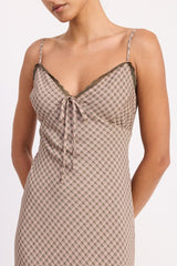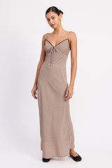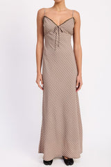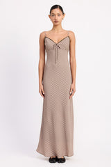 BIAS CUT FLARED MAXI DRESS WITH LACE TRIM