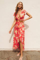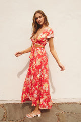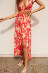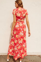 This is a floral print set with a wrap top and a surplice tulip skirt. Model is 5'10" and wearing size Small. - Short sleeve - Versatile wrap design, can be tie front or overlapped. - Elasticated back waistband Shell: 100% Polyester Lining: 100% Polyester